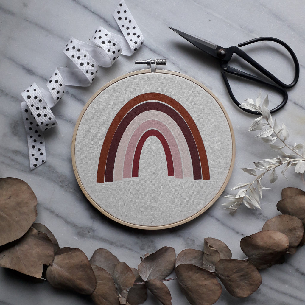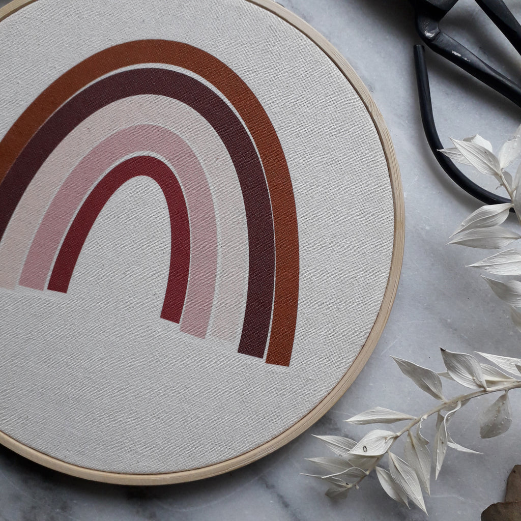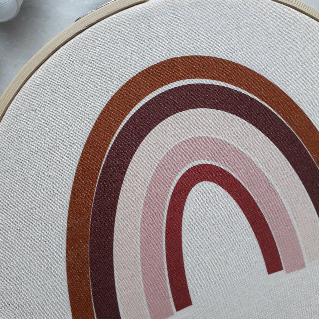 Stickrahmen mit einem aufgedruckten Regenbogen, wie abgebildet.